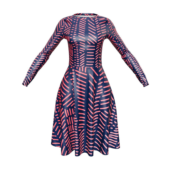 Blue and Red abstract print long sleeve midi dress
